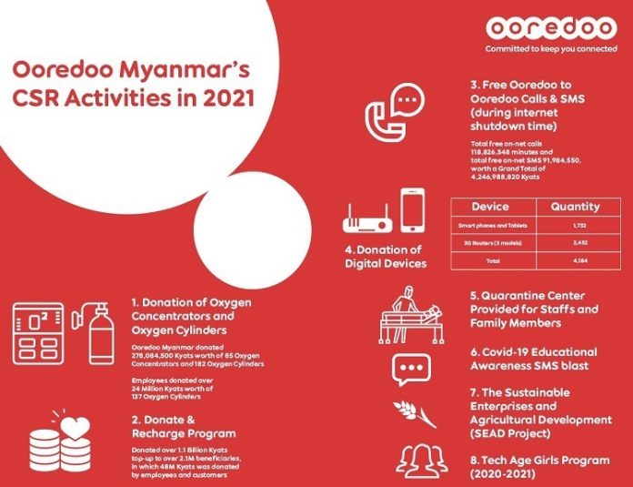 Ooredoo Myanmar has released its Corporate Social Responsibility (CSR) 2021 Report, which describes the progress and comprehensive efforts they have made to not only enrich people’s digital lives, but also to improve the daily lives of Myanmar people through COVID-19 emergency response in the health sector, community engagement, digital development in the education sector, and women empowerment.